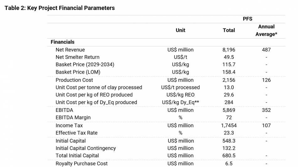 LOM average realized prices were assumed at US$3,941/kg for Tb, US$2,054/kg for Dy, and US$118.7/kg for NdPr.