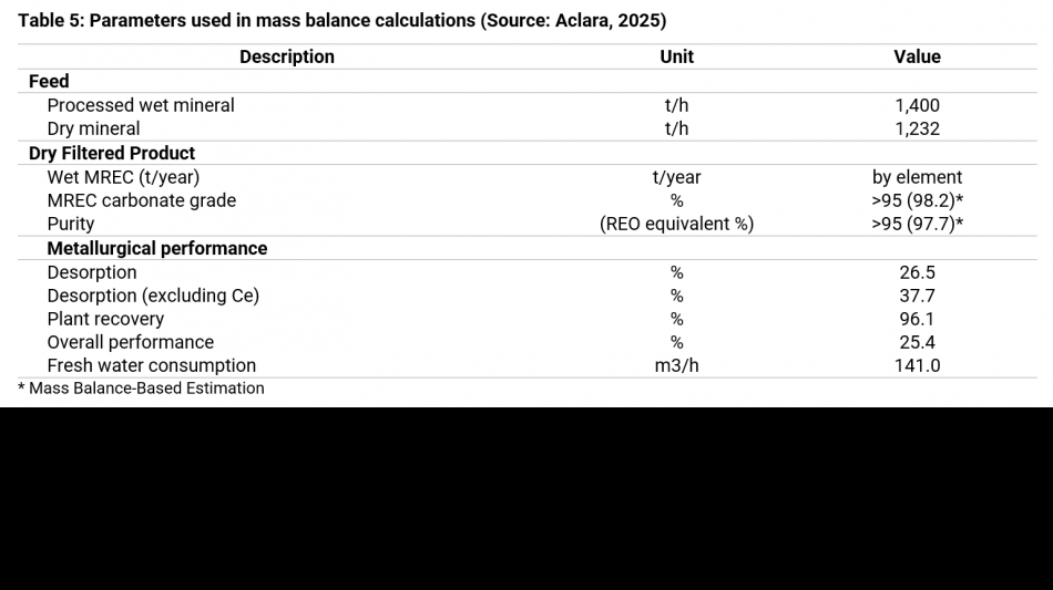 Before the clays exit the process plant, they are washed with clean water within standard plate-and-frame membrane filter presses. The wash removes any residual ammonium sulfate from the clays before they are returned to the deposition zone or used to back-fill the extraction zones for revegetation. Table 5 lists the key process design criteria used in the mass balance calculations.