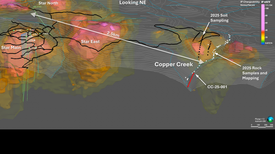 Company CEO Darryl Jones notes "Collectively, the 2025 campaign mapping, soils sampling and first drill hole confirms continuity with historic copper mineralization and meaningfully advances Copper Creek toward identifying the porphyry-style source driving the drainage-scale anomalies. The drilling data significantly increases the overall scope of our Star Project and offers intriguing early indications of a regional large scale copper deposit. We are compiling results from the 2025 fieldwork and look forward to reporting the assay results from drill hole CC-25-001 as well as the related sampling which is sure to have an interesting and potentially very positive impact on our plans for 2026 with the aim to extend confirmatory drilling on the Copper Creek target."