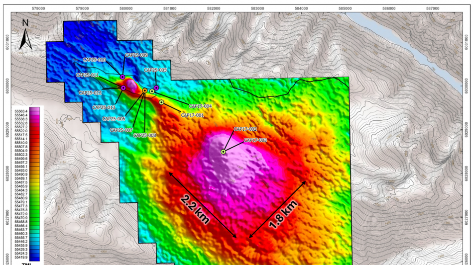 The airborne magnetic survey delineates a large, well-defined magnetic high measuring approximately 2.2 km by 1.8 km, with a smaller magnetic offshoot extending northwest (Figure 1). The offshoot roughly correlates with the 1.8 km niobium-in-soil trend identified during the 2024 exploration program, which was subsequently confirmed in the subsurface during 2025 drilling. All drillholes completed in 2025 intersected carbonatite and/or associated alteration, with drillhole CAP25-006 returning 0.59 % Nb₂O₅ over 36.0 m, demonstrating a spatial correlation between magnetic intensity and niobium mineralization.