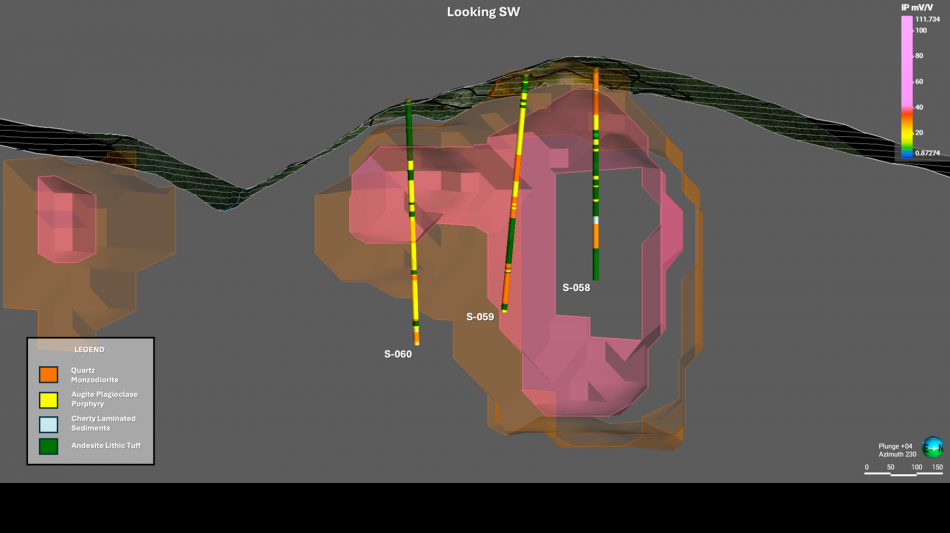 Drilled to 317m, S-059 was designed to probe steep structures and intrusive contacts in the north central Star Main area above a prominent IP chargeability high. This hole intersected fractured QMD cut by discrete clay-rich faults zones that provided fluid abundant hydrothermal fluid pathways. Logging records pervasive to patchy potassic (K-feldspar) alteration, magnetite accessories, and sheeted quartz-pyrite-chalcopyrite veinlets with local stockwork development, features typical of the outer core of porphyry copper systems and aligned with the corridor tested to the south by S-056/57 (See Figure 4).