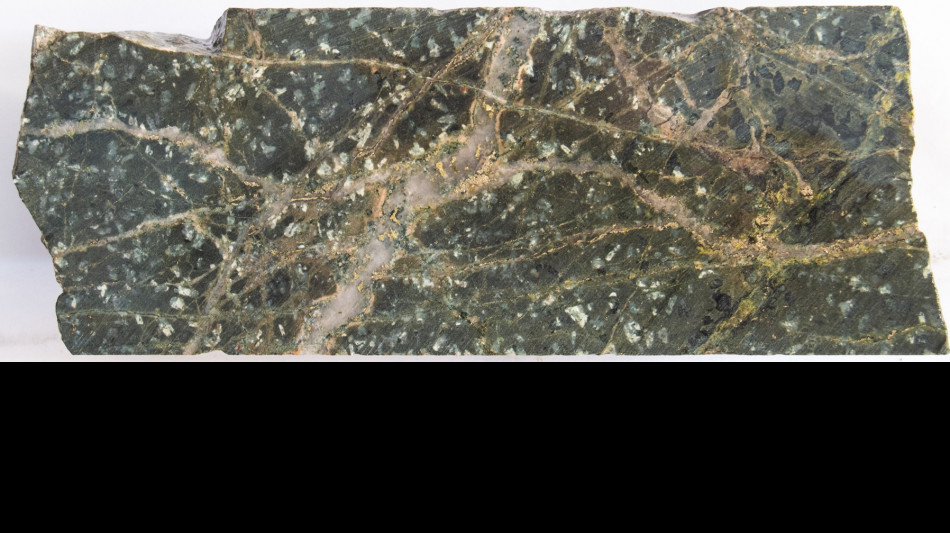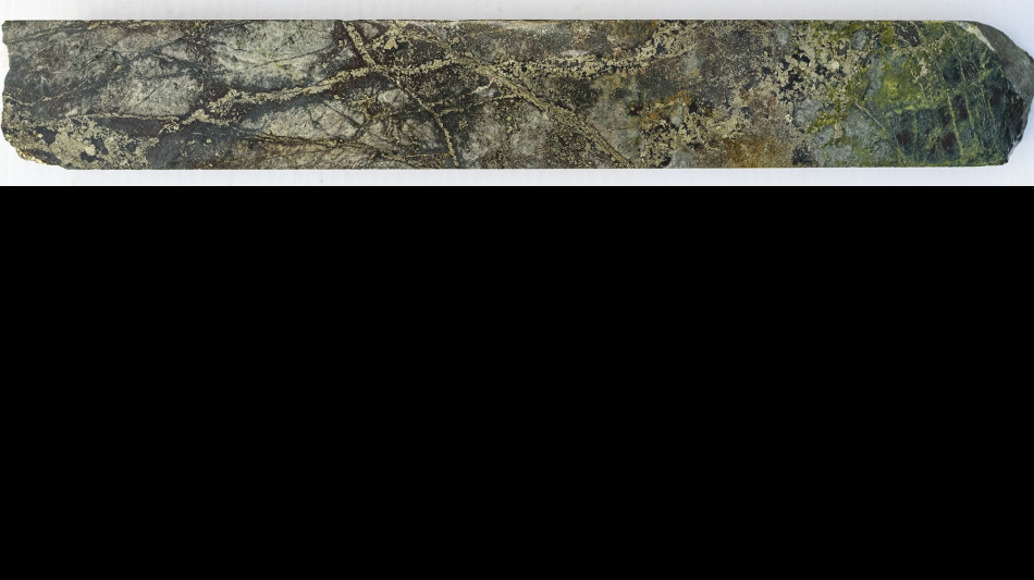 Hole S-058, drilled vertically, cut oxidized quartz monzodiorite (QMD) before transitioning into a layered volcanic sequence (plagioclase-porphyry and andesite tuffs) marked by propylitic chlorite-epidote-magnetite alteration and local vein-related potassic halos. Below ~130 m the core is densely veined by quartz-pyrite-chlorite-magnetite- chalcopyrite (D-type) veins, with chalcopyrite increasing with depth in these vein sets. This trend is consistent with the northward continuation of Star Main's hypogene system and historic mineralization to the south at S-037 (See Figure 3).