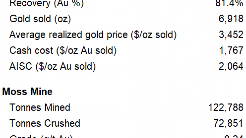 At the Moss mine, third quarter sales of 912 oz were almost exclusively from residual leaching activities. Cash Costs and AISC were elevated, as operating costs were allocated to a relatively low number of ounces sold. Mining recommenced in August 2025, after a 12-month hiatus, initially with a single shift with a second shift added in mid-October. Consistent with the start of mining and stacking of mineralization to heap leaching, gold production is beginning to ramp up, with steady state production anticipated towards the latter half of Q1 2026.