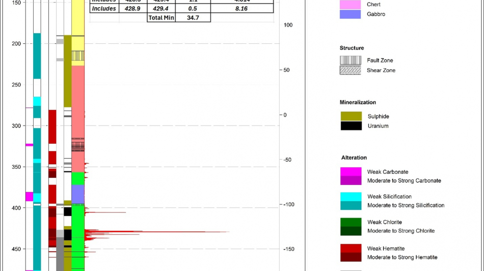 The widest continuous intersection in the hole - from 426.3 to 439.9 - returned 13.6 m of composite uranium mineralization1 grading 0.53% U3O8, including 1.1 m grading 4.81% U3O8 with the highest-grade sample returning 8.16% U3O8 over 0.5 m;