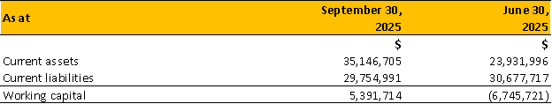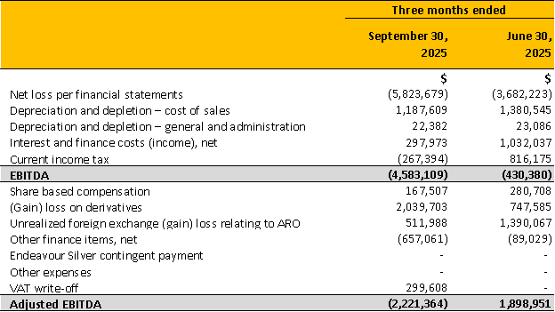 The financial results were as follows for the three months ended September 30, 2025 and June 30, 2025. The Company notes that 44% of the net loss consists of non-cash items, including foreign exchange loss, share-based compensation, and loss on derivatives stemming from the Company's sole outstanding loan.