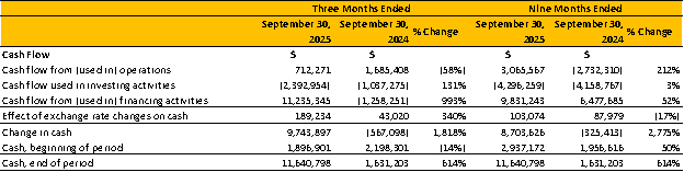 The table below presents a summary of the Company's consolidated cash flow for the three-month and nine-month periods ended September 30, 2025 and 2024.