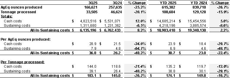 Average AgEq head grades declined by 4% in 3Q25 vs. 3Q24, and by 9% for the nine-month period ended September 30, 2025, vs the same period in 2024.