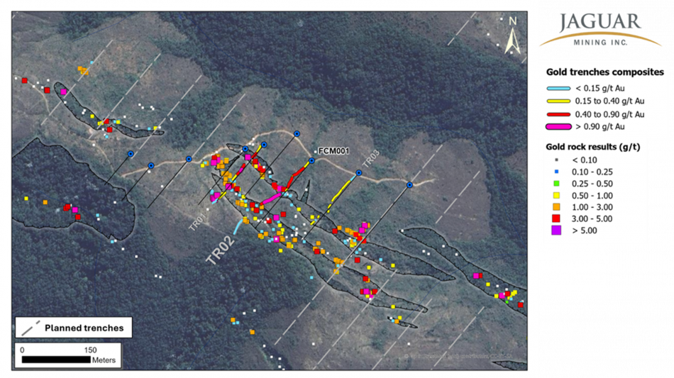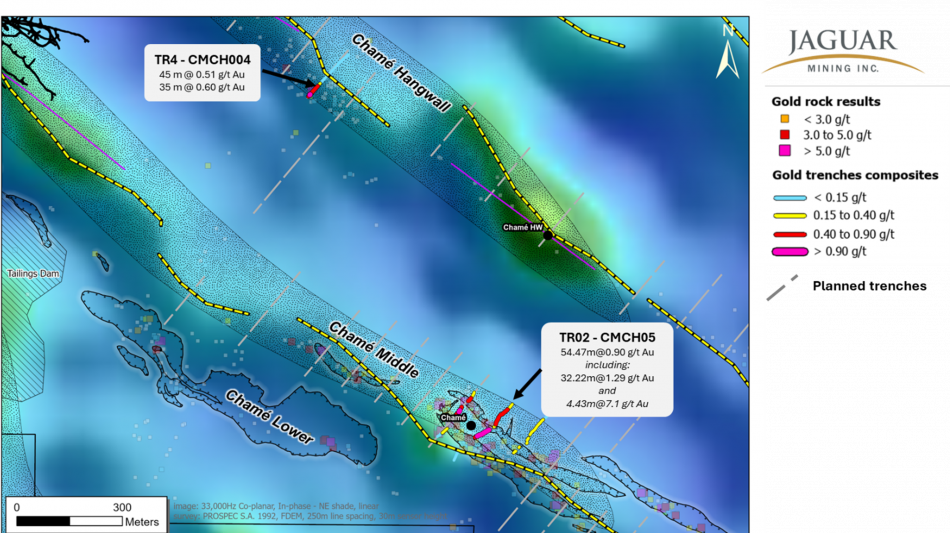 The Chamé drill program follows up on initial encouraging results (see Jaguar Mining press release dated September 9, 2025) and builds on strong trenching results from Trench TR02, which returned: