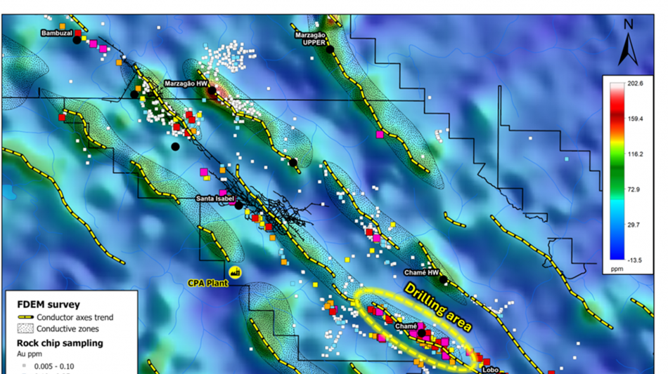 The Chamé target is located within the São Vicente lineament, which is an important mineralized crustal shear zone, characterized by a curvilinear geometry that stretches for approximately 60 kilometres across the Iron Quadrangle, following a northwest-southeast structural orientation. This lineament contains several orogenic gold deposits and exploration prospects, including Santa Isabel mine, Marzagão mine, Bahú, Engenho d'Água, Bicalho, Bela Fama, and Morro Velho, among others.