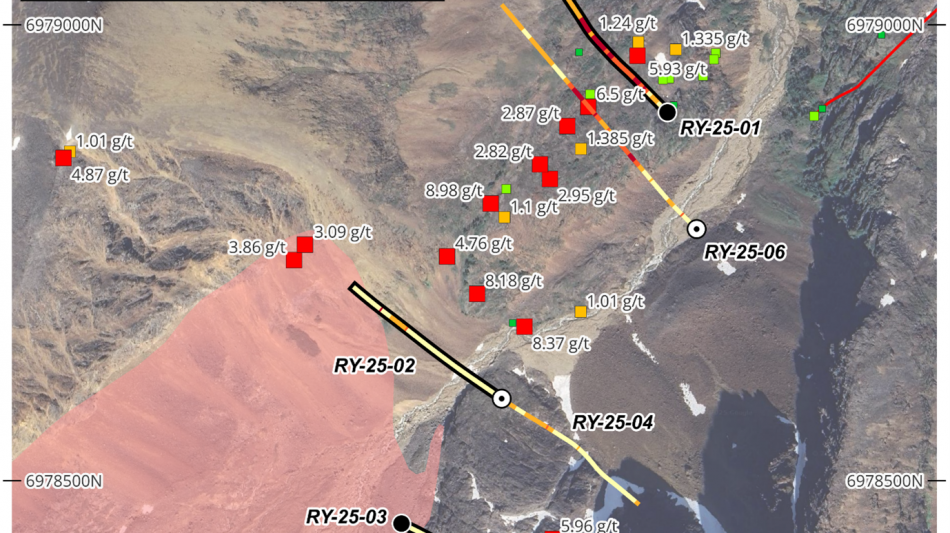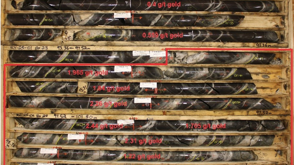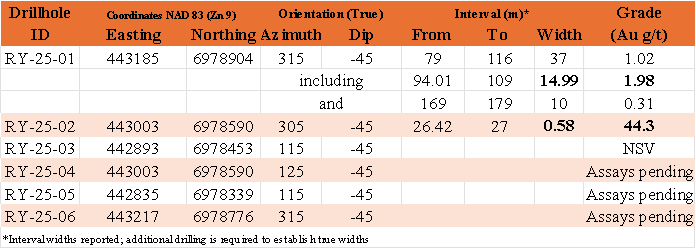 Drill hole RY-25-01 intersected 1.02 g/t gold over 37 metres, including 1.98 g/t gold over 15 metres.