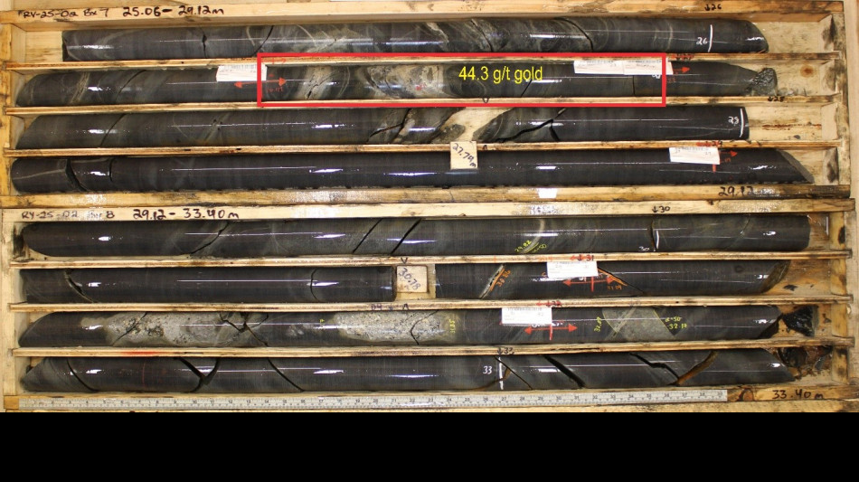 Photo 2 - Drill core from hole RY-25-02, between 25.06 to 33.40 m, with an intercept of 44.3 g/t gold over 0.58 m highlighted.