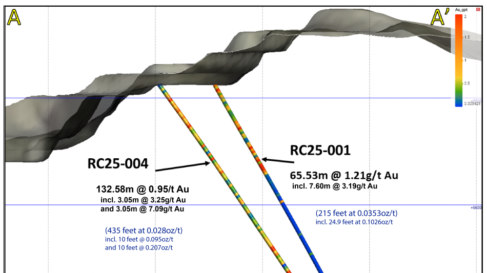 RC25-004 had a broad intercept of 132.58m @ 0.95g/t Aufrom 3.05m. incl 3.05m @ 3.25g/t Aufrom 27.43m and 3.05m @ 7.09g/t Aufrom 112.8m).