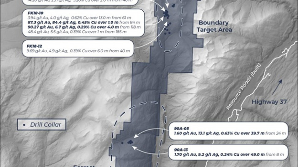 The Forrest Kerr Project is host to three large prospective porphyry copper-gold and epithermal gold-silver target areas that are located at RDN, Boundary, and Forrest Creek (Figure 2). Additional opportunities exist to improve upon high-grade gold intercepts such as 90.27 g/t Au over 4 m[1] through structural analysis and further exploration.