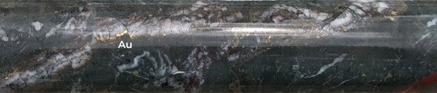 The Boundary Target Area is approximately 2.5 km north south and 350-800 m wide. The target area includes both high-grade polymetallic veins as well as grassroots copper-gold porphyry targets. Previous targeting along the trend focused on tightly spaced drilling of gold-bearing veins flanking the broader copper-in-soil anomalism (Figure 2 & 3). Surface geological work and ground IP geophysical survey datasets are suggested to better identify porphyry copper-gold drill targets at Boundary. Visible gold has been noted in historical drill core (Figure 6).