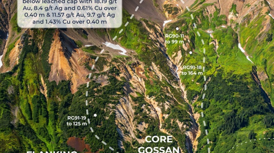 The RDN Target Area includes high-grade polymetallic vein prospects (Table 1) cored by a bright white-yellow core gossan body (Figure 5) interpreted to be a leached cap above a possible porphyry system. The total extent of both the gossan and the geochemical anomalies on surface is at least 10 km northerly and ranges 1.5 to 3 km wide (Figure 2). The core gossan target area in Figure 5 is marked by complete loss of original rock character, depressed copper-gold values compared to flanking domains, white colour (iron loss), and recessive nature. These features together in the heart of the alteration body can be indications of a leached cap, which is a common feature of porphyry copper-gold systems. Only three shallow historical holes test the outer margin of the core gossan target area, including hole RG90-11 with 18.19 g/t Au, 8.4 g/t Ag and 0.61% Cu over 0.40 m from 26.05 m and 11.57 g/t Au, 9.7 g/t Ag and 1.43% Cu from 51.00 m[8] downhole. The Company considers the core gossan body as a high priority, large-scale porphyry target. The Company sees similarities between the RDN and the Hank gossans and plans to apply key learnings, including spectral geology and IP geophysical surveys to further refine this target.