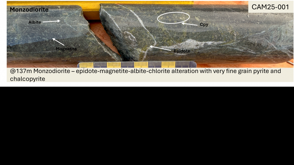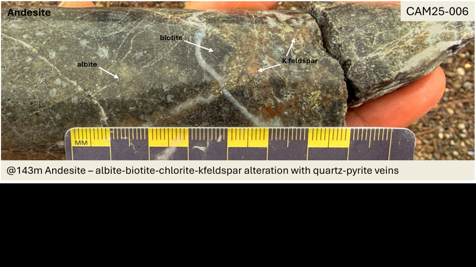 Hole CAM25-003 showed weak to moderate porphyry-style alteration, dominantly quartz veins with lesser K-feldspar veins, and pyrite with lesser chalcopyrite mineralization; all generally increasing in intensity with depth.