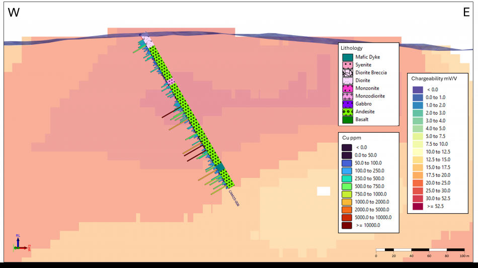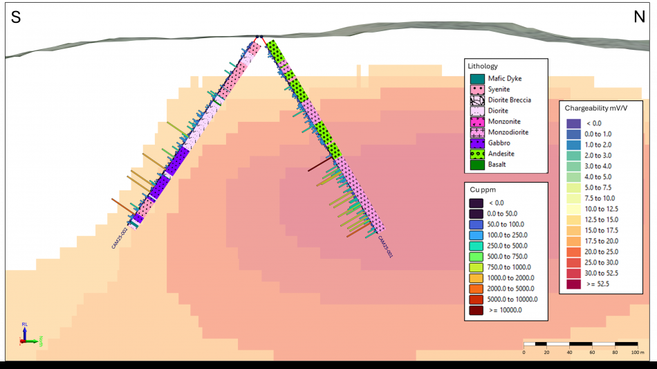 Figure 6: 100 m wide cross section, looking West and over mV/V chargeability model: CAM25-001 (right) and CAM25-002 (left), lithology plotted on the right, and ppm copper measured by pXRF on the left.