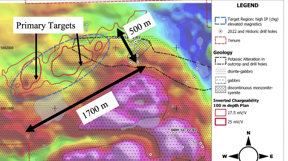 The project area benefits from year-round road access and excellent regional infrastructure. Previous exploration workii,iii has outlined a 1700 m x 500 m coincident chargeability-magnetic anomaly trending northeast-southwest beneath shallow till cover in an area that has not been previously drilled (Figure 3).