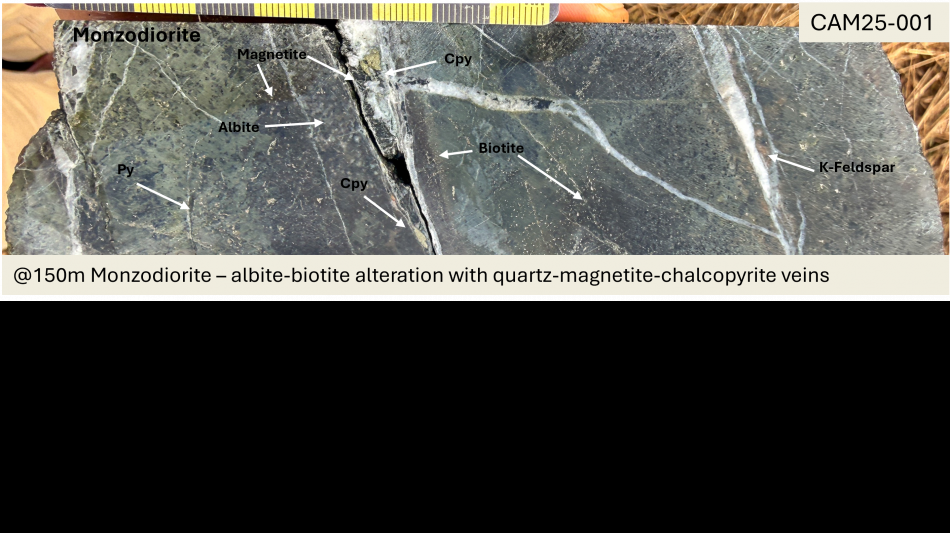 Mineralized intervals are associated with overprinting alteration and vein assemblages, particularly holes CAM25-001, 002, and 006. These intervals exhibit multiple episodes of moderate to strong porphyry-style alteration and veining, which includes strong K-feldspar, albite, and epidote alteration.