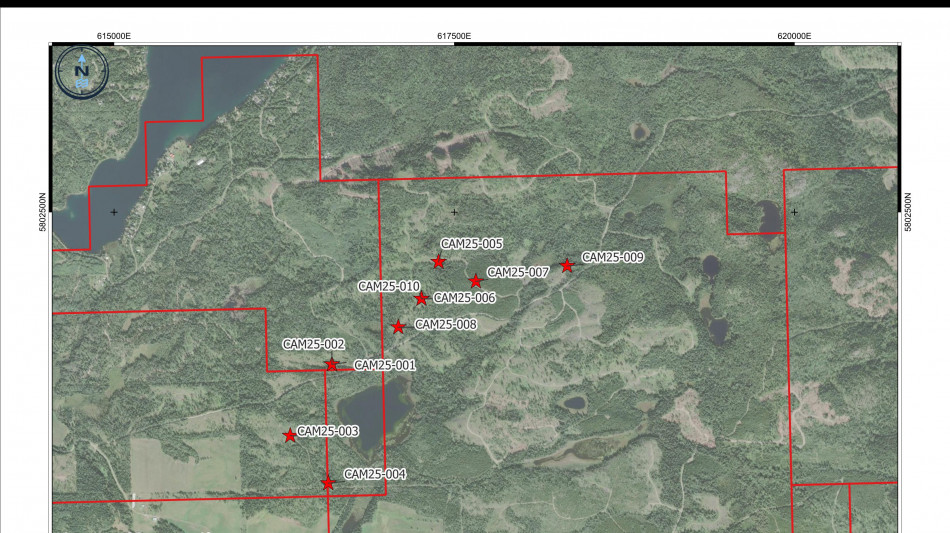 To test as many targets as possible, holes CAM25-001, -002, and -006 were stopped at about 200 m, despite the presence of pyrite and chalcopyrite at the bottom of the holes. Drill core samples from holes CAM25-001 and CAM25-006 has been sent for "rush" assay.