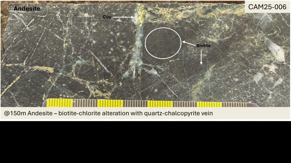Drill hole CAM25-006 intersected variably K-feldspar altered andesite, diorite, and monzodiorite, hosting minor amounts of fine disseminated pyrite and 1-4% pyrite veinlets, as well as weak to trace very fine grain chalcopyrite from 140 m depth to the end of hole.