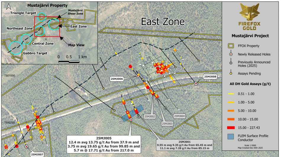 SODANKYLÄ, FINLAND / ACCESS Newswire / December 8, 2025 / FireFox Gold Corp. (TSX.V:FFOX)(OTCQB:FFOXF)("FireFox" or the "Company") is pleased to report results from an additional four holes of its 2025/26 diamond drilling program at the Company's 100%-held Mustajärvi Gold Project in Lapland, Finland. Drill hole 25MJ005 is among the best holes yet drilled on the property, extending both shallow and deeper high-grade gold zones well to the west from previous drilling at the East Zone. Highlighted intervals are shown below: