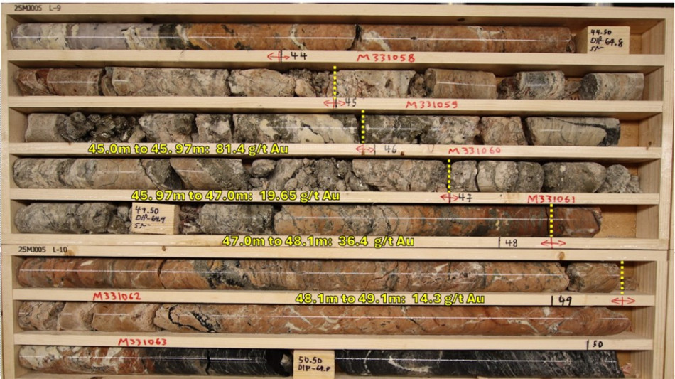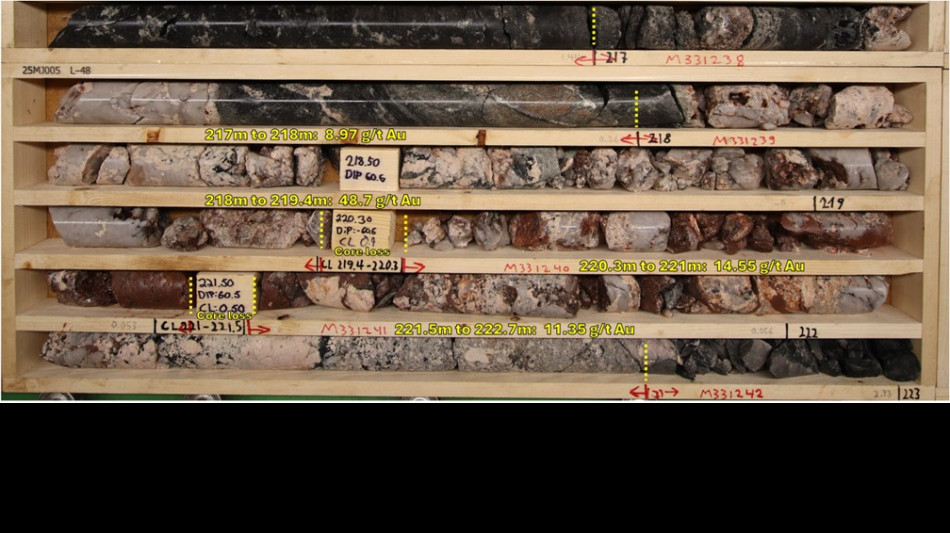 Drill hole 25MJ006 extended the fence of holes made by 25MJ002 to 25MJ004 (See Company news release dated October 27, 2025). It was collared 125 metres further to the northwest (Figure 1) to test the lithological controls of mineralization in this direction. The hole drilled intensely altered metasediments and intersected three narrow mineralized intervals above 0.5 g/t Au. The most notable interval was at 145 metres depth and returned 1.0m at 16.8 g/t Au. The high-grade mineralization is associated with a brecciated interval including QCTP veining within intensely altered metasediments.
