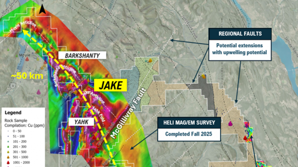 "Koocanusa is a rare opportunity to test a district scale sediment-hosted copper system in British Columbia. With permits secured and targeting refined through geological, structural, and geophysical datasets, we are now positioned to move into the first phase of drilling at the Jake target, pending completion of our financing. The hinge of the Jake Anticline represents an ideal location for focusing mineralizing fluids, and the historical drilling nearby confirms that copper does occur down-dip within the Middle Creston Formation. We are excited to begin drilling and to advance the Koocanusa Project toward its first subsurface discovery."