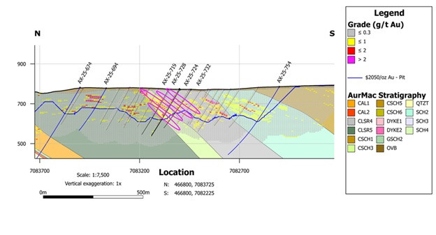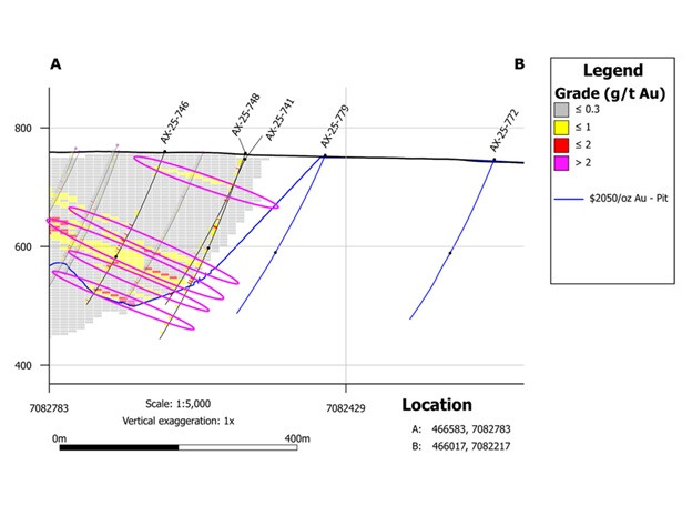 "We have successfully intersected high-grade intervals at the Resource pit edge with additional sheeted veins hosting coarse sulphosalts, sulphides and visible gold in follow-up step outs 100 and 400 m from known mineralisation, with assay results pending (holes AX-25-772 and -779 respectively, Figure 5)," said Tara Christie, Banyan President and CEO. "Our new geologically supported mineralisation model continues to provide opportunities to upgrade portions of our deposit by converting waste blocks to high-grade ore, reducing strip ratios within the conceptual pit and by expanding the mineralized envelope to add ounces."