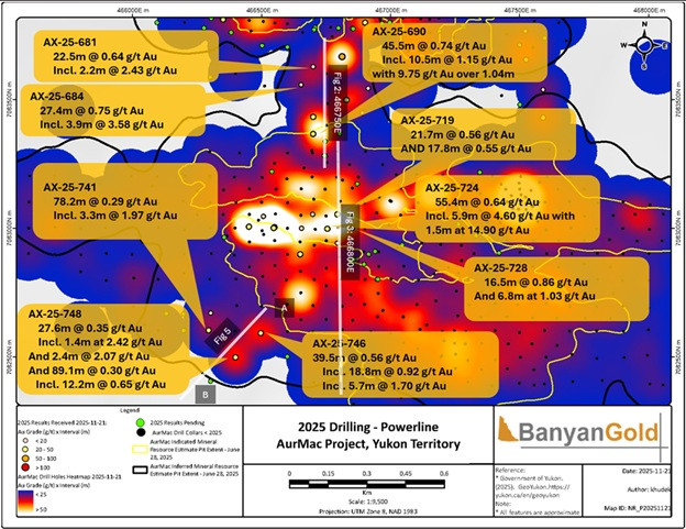 VANCOUVER, BC / ACCESS Newswire / December 9, 2025 / Banyan Gold Corp. (the "Company" or "Banyan") (TSXV:BYN)(OTCQB:BYAGF) continues to expand and upgrade the Powerline Deposit ("Powerline") at its AurMac Project ("AurMac"), First Nation of Na-Cho Nyäk Dun Traditional Territory, Yukon. The diamond drillholes reported here intersected new high-grade domains extending Powerline mineralization to a new area southwest of the main deposit and demonstrating the continuity of high-grade in the central Powerline deposit and between the Airstrip Deposit.