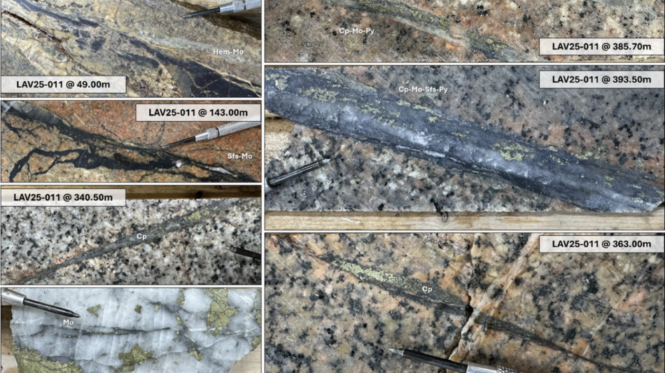 LAV25-011 intersected visually striking, coarse-grained copper and molybdenum mineralization hosted in quartz veins measuring up to 40-centimetres thick below 550 metres depth.