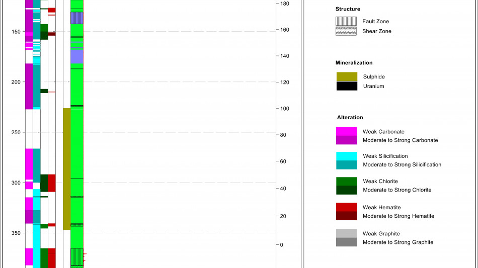 RIBS-DD-001 assays returned total composite uranium mineralization1 of 2.0 m encompassing two zones from 158.5 m to 252.1 m (Figure 8), including 1.5 m from 250.6 m to 252.1 m with an average grade of 0.11% U3O8;