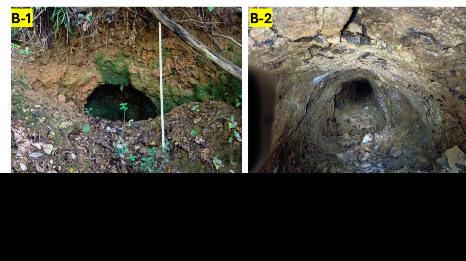 Figure 5 Sample locality of Fig.4, a northeast-southwest trending historical tunnel at the Unoya mine area (B-1, the scale in 1m) and its crawl-in image (B-2).