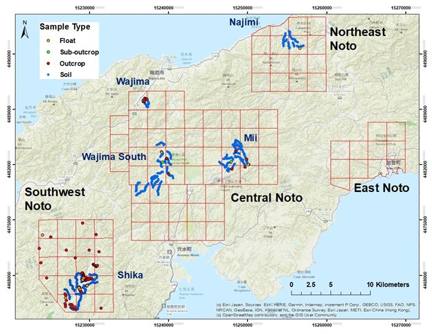 Surface soil and rock chip sample analytical results for Central Noto (Wajima, Wajima South and Mii) and Northeast Noto (Najimi) have been returned from the laboratory. Sample results for Southwest Noto (Shika Prospecting Right) are currently being analyzed with results pending.