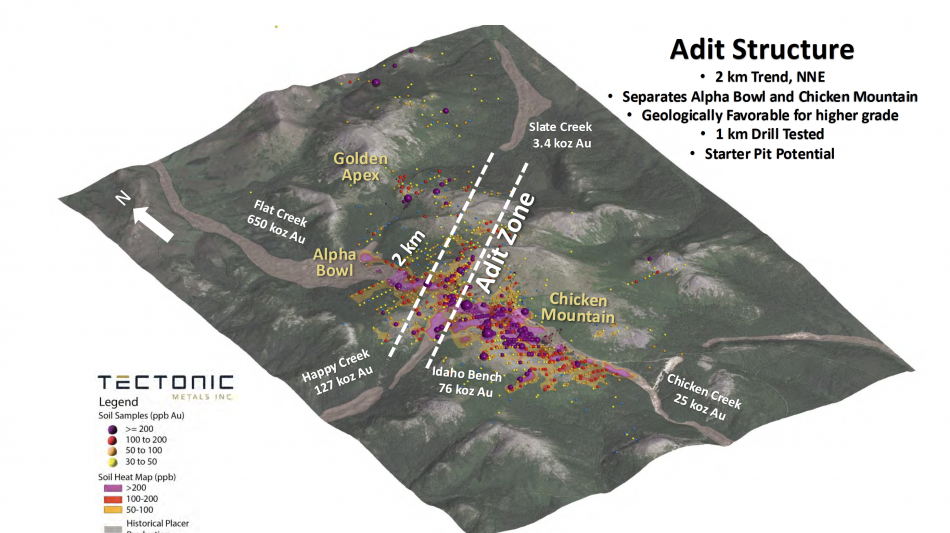 The Adit Zone represents a high-priority, 2 kilometre ("kms") long gold target within the Chicken Mountain intrusion. The zone is defined by a strong gold-in-soil anomaly coincident with a magnetic low, a geophysical signature commonly associated with hydrothermal alteration and gold mineralization at the Flat Project and in Reduced Intrusion-Related Gold Systems ("RIRGS").