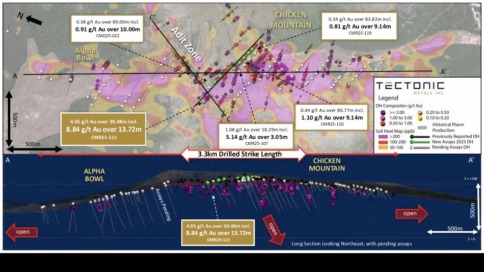 VANCOUVER, BC / ACCESS Newswire / December 22, 2025 / Tectonic Metals Inc. ("Tectonic" or the "Company") (TSX-V:TECT)(OTCQB:TETOF) today announced additional assay results from 11 drill holes completed during the 2025 drill campaign at Chicken Mountain and the Adit Zone, located within the Company's flagship ~99,800 acre Flat Gold Project ("Flat") in Southwest Alaska.