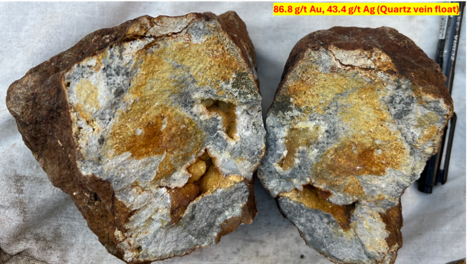 With the completion of the Phase III soil program in mid-December 2025, a combined total of 673 soil samples and 57 surface rock samples (excluding QAQC samples) were collected. Assay results from surface rock float samples collected during the Phase I and Phase II soil programs returned a peak value of 86.8 g/t Au and 43.4 g/t Ag from a quartz vein sample (Figure 6).