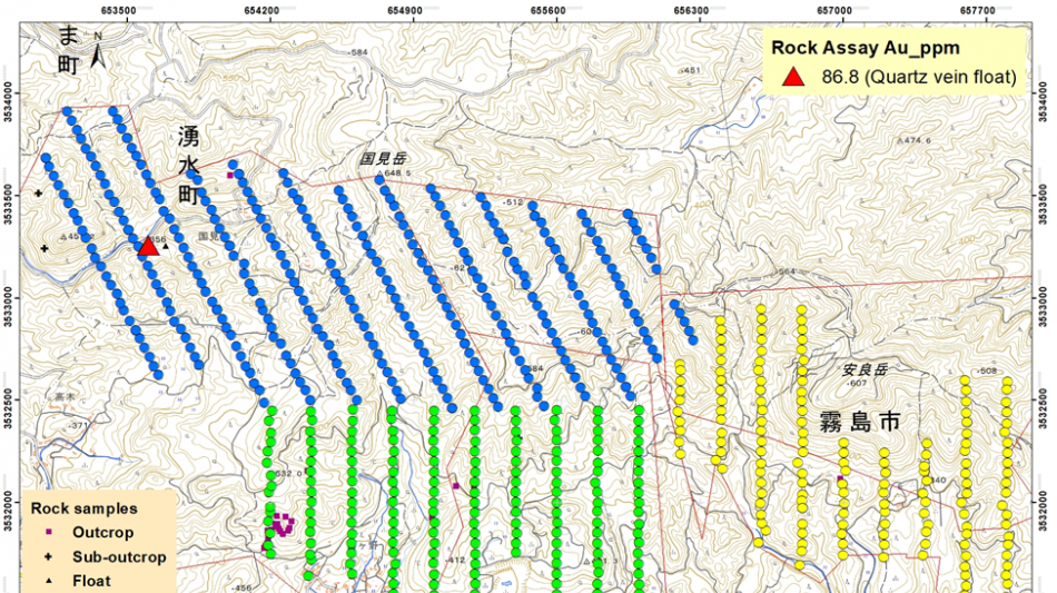 Phase I soil assay results have already yielded multiple samples returning values greater than 1,000 ppb Au (>1 g/t Au), with the highest value of 7,940 ppb Au (7.94 g/t Au) and 5.2 g/t Ag, located approximately 500 m southwest of the historical Yamagano mine workings. Elevated concentrations of Au, Ag, and As were detected proximal to historical mining areas with several anomalous trends extending eastward. In addition, anomalous Hg and Sb values exhibit similar spatial patterns while also extending in a southward and southwestward direction from the historical mine workings.