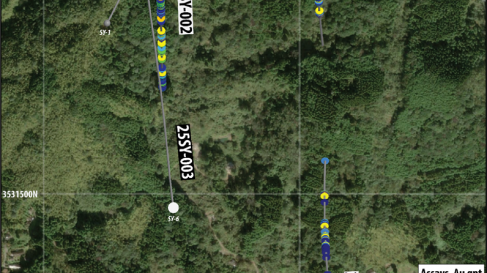 Irving recently completed its fifth diamond drill hole at Yamagano East, 25SY-002A, drilled to a depth of 951.8 m at an azimuth of 357° and inclination of 66° (Figure 1). The collar of 25SY-002A is located approximately 1.07 km south of earlier drill hole, 25SY-001.