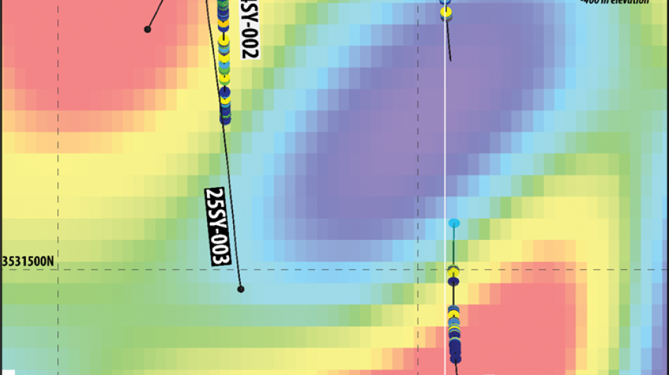 Irving has also recently completed another drill hole, 25SY-003, located approximately 500 m south of 23SY-001 (Figure 1). Hole 25SY-003 was drilled to a depth of 900.30 m at an azimuth of 350° and inclination of 53°. This hole targeted the same resistive feature previously tested by drill holes 23SY-001 and 24SY-002 (see the Company's news release dated May 5, 2025) but from the south so that the southern flank and deeper levels of this resistive body could be tested. Three notable zones of hydrothermal alteration characterized by silicification and veining were logged beginning at approximately 130 m, 300 m and 625 m downhole, respectively. Assaying of drill hole 25SY-003 is currently underway.