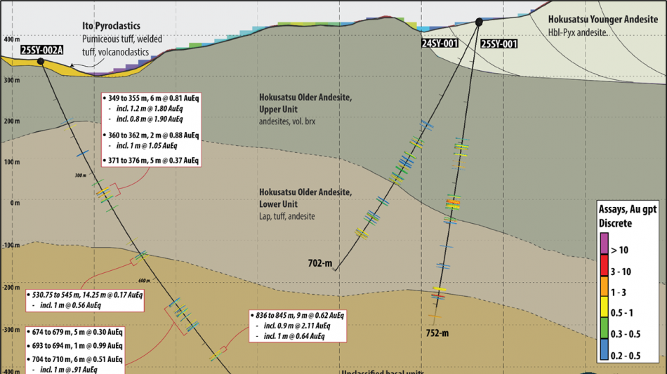 Hole 25SY-002A intersected multiple anomalous gold-bearing intervals associated with silicification and stockwork veining. Anomalous gold mineralization continues to depth culminating in the highest gold grade intersection in the hole, 2.11 g/t Au from 837.43 m to 838.33 m (Figure 4). Irving considers these results favourable because they indicate that the Yamagano epithermal gold system extends to depths of at least 450 m below those reached by historical mining operations.