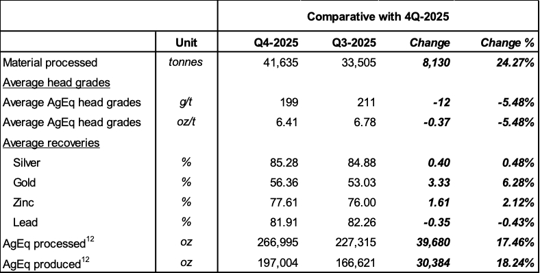 Silver equivalent ounces ("AgEq") processed rose to 266,995 oz in 4Q25, compared to 227,315 oz in 3Q25-a 17% sequential improvement-driven primarily by higher throughput while maintaining consistent head grades.