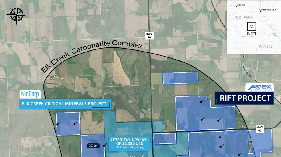Apex Critical Metals Corp. is a Canadian exploration company focused on advancing rare earth element (REE) and niobium projects that support the growing demand for critical and strategic metals across the United States and Canada. The Company's flagship Rift Project, located within the highly prospective Elk Creek Carbonatite Complex in Nebraska, U.S.A., hosts extensive rare earth rights surrounding one of North America's most advanced niobium-REE deposits. Historical drilling across the complex has reported broad intervals of high-grade REE mineralization, including intercepts such as 155.5 m of 2.70% REO and 68.2 m of 3.32% REO.