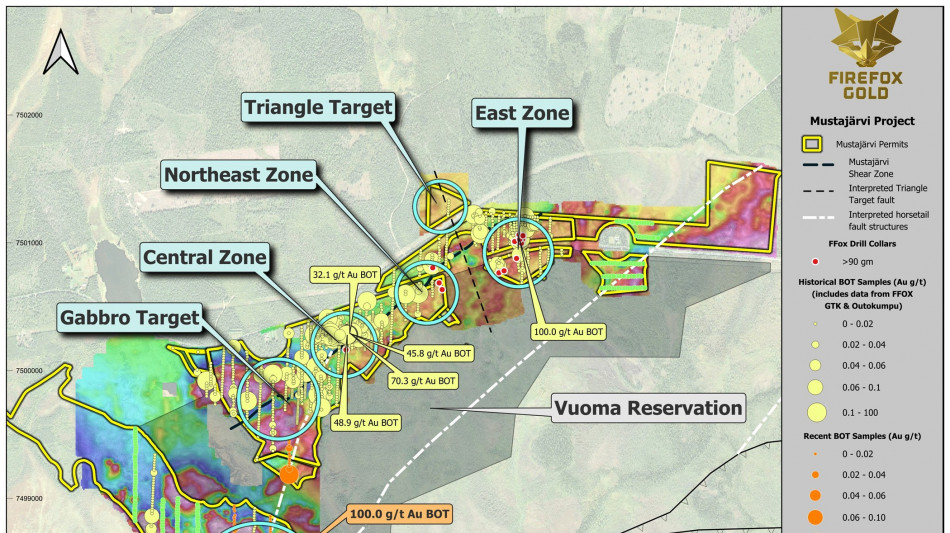 SODANKYLÄ, FINLAND / ACCESS Newswire / January 12, 2026 / FireFox Gold Corp. (TSX.V:FFOX)(OTCQB:FFOXF)("FireFox" or the "Company") is pleased to share an exploration update from its 100%-held Mustajärvi Gold Project in Lapland, Finland. New drill targets have emerged well away from previously reported high-grade drill results in the Northeast and East Zones. The new targets are based on new gold anomalies in base-of-till (BoT) sampling and geophysical anomalies, both of which correlate with attractive structural settings and other favourable indicators. Perhaps most significant, one new BoT sample returned more than 100 g/t gold in an undrilled area near a major structural intersection two kilometres southwest from any previous drilling. FireFox will be targeting this area and the new geophysical anomalies with new drilling as part of its ongoing Mustajärvi drill program.