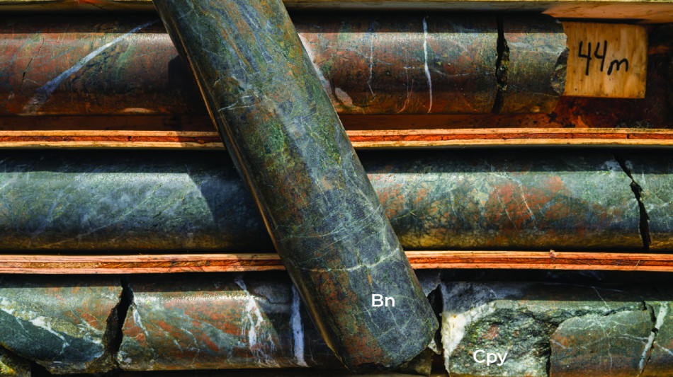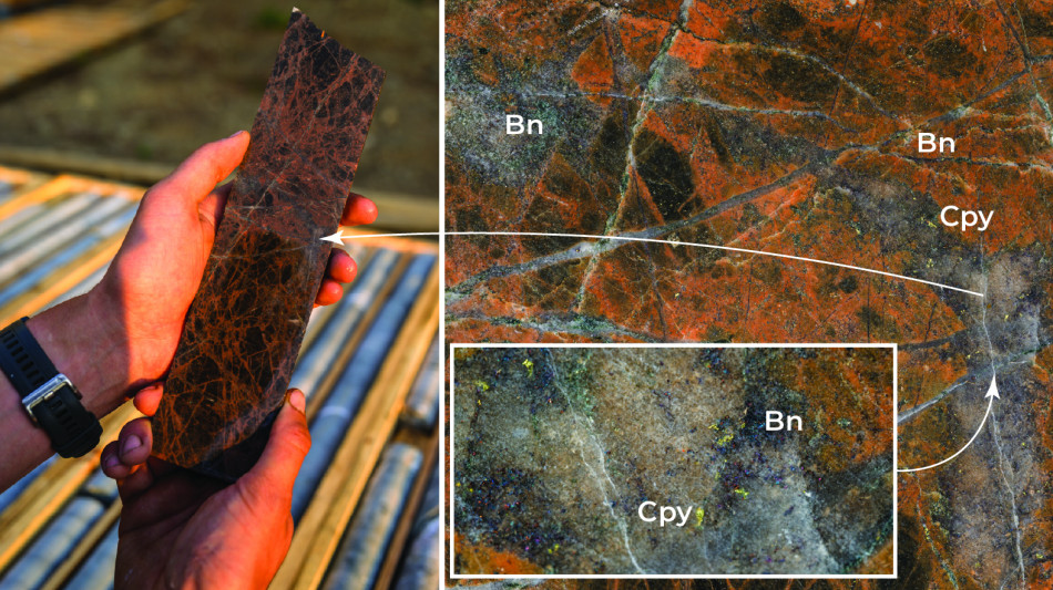 Figure 3: HW-25-008 - 315 m downhole - 0.68 % Cu, 0.94 g/t Au, & 4.0 g/t Ag (1.75 % CuEq ), (Bn = Bornite, Cpy = Chalcopyrite) Potassic alteration with copper sulfide mineralization
