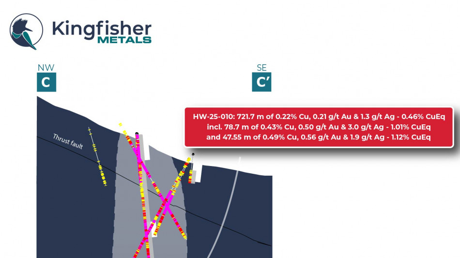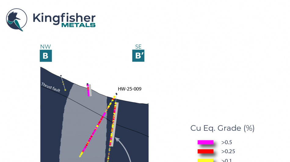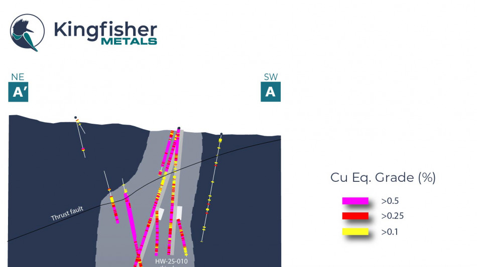 Further to the release dated November 10, 2025 ( Kingfisher Metals Reports 110 Meters of 0.47 g/t Gold in ~500 m step-out at Hank and Extends Gold in Soil Anomaly at Hank on the HWY 37 Project, Golden Triangle, British Columbia ), multielement assay results from HW-25-006 has been received. The new data updates the intersection to 241.0 m of 0.01% Cu, 0.28 g/t Au, and 0.4 g/t Ag (0.29 g/t AuEq) including 110.0 m of 0.01% Cu, 0.47 g/t Au and 0.2 g/t Ag (0.49 g/t AuEq) . The values are summarized in table 2 (below).