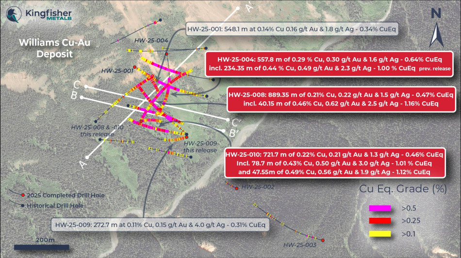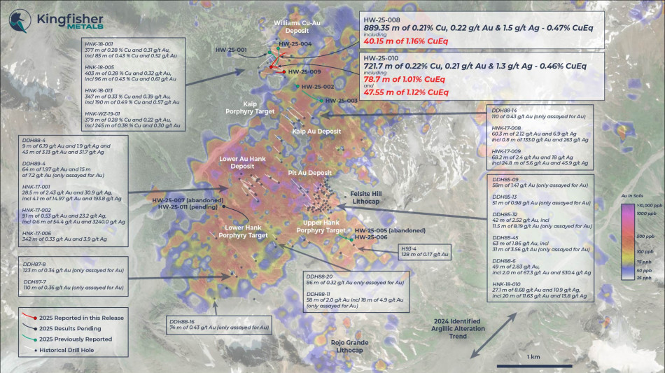 "The Williams drilling continues to demonstrate a well-mineralized porphyry system with copper-gold mineralization extending from surface over long intervals," said Dustin Perry, CEO of Kingfisher. "While Williams is interpreted as a satellite to a larger porphyry system at Hank, the presence of bornite and localized higher-grade intervals highlights the fertility of the broader system. These results provide geological context for the Hank porphyry system identified in the final hole of the program (HW-25-011), with results expected to be released in the near term."