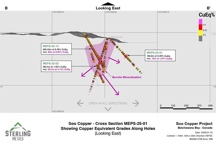 TORONTO, ON / ACCESS Newswire / January 15, 2026 / Sterling Metals Corp. (TSXV:SAG)(OTCQB:SAGGF) ("Sterling" or the "Company") is pleased to report new assay results from its expanded and completed 2025 drilling program at the Soo Copper Project ("Soo Copper" or the "Project") located near Batchewana Bay, Ontario. These new results continue to expand a continuous zone of porphyry copper mineralization first highlighted earlier last year in MJ-25-01 which was later found to contain very high-grade bornite mineralization as previously reported in discovery hole MEPS-25-02 (see press release dated September 29, 2025).