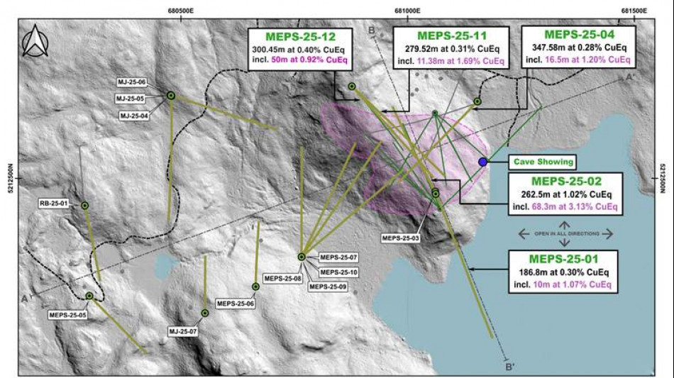 MEPS-25-11 intersected 279.5m of 0.31% CuEq starting at 135.2m depth, including 11.4m of 1.69% CuEq starting at 344.1m depth.