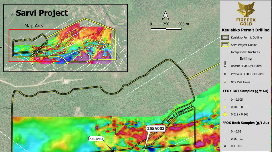 SODANKYLÄ, FINLAND / ACCESS Newswire / January 21, 2026 / FireFox Gold Corp. (TSXV:FFOX)(OTCQB:FFOXF)("FireFox" or the "Company") is pleased to report the first results from 2025 drilling into a new target at the western end of the Company's 100%-held Sarvi gold project ("Sarvi") in Lapland, Finland. Drill hole 25SA003 encountered a high-grade gold zone of 1.75 metres averaging 27.48 g/t, including 0.8 metres at 53.50 g/t gold, from 73.4 metres downhole depth. The target concept for this small reconnaissance drill program was to examine interpreted regional scale structures cutting through discrete magnetic highs and magnetic gradients (transitions from highly magnetic to less magnetic rocks). As previously reported, reconnaissance drilling by the Geological Survey of Finland (GTK) nearby encountered narrow intervals of moderate gold grade (See Company news release dated November 18, 2025).